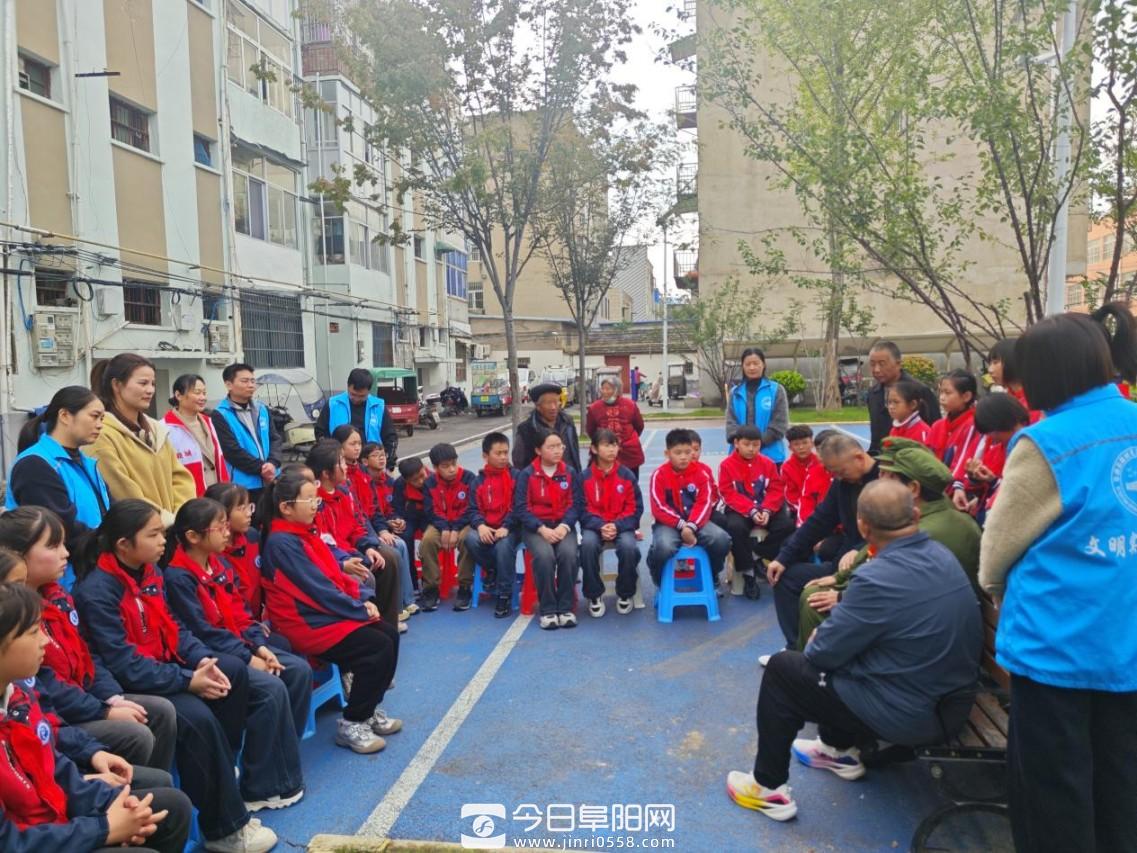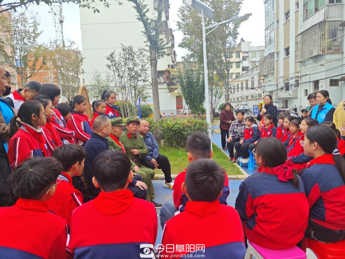 在中国人民志愿军抗美援朝出国作战 75 周年纪念日来临之际,阜南县鹿城镇红旗社区新时代文明实践站于 10 月 24 日在一职高口袋公园开展红色教育活动,邀请抗美援朝老兵陶广忠为青少年讲述抗美援朝的烽火故事。
