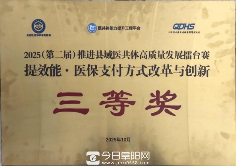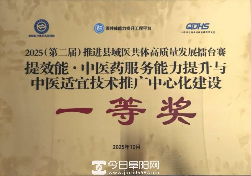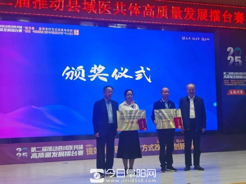 10月25日,在2025(第二届)推进县域医共体高质量发展擂台赛中,阜南县推荐的“中心赋能,一体联动——阜南县中医药服务共同体建设的新模式”和“医保控‘本’+医疗控‘体’—— 以慢性病管理为切口,探索本地化管理新路径”两个案例在全国范围内参赛的案例中脱颖而出,分别荣获一等奖、三等奖佳绩。